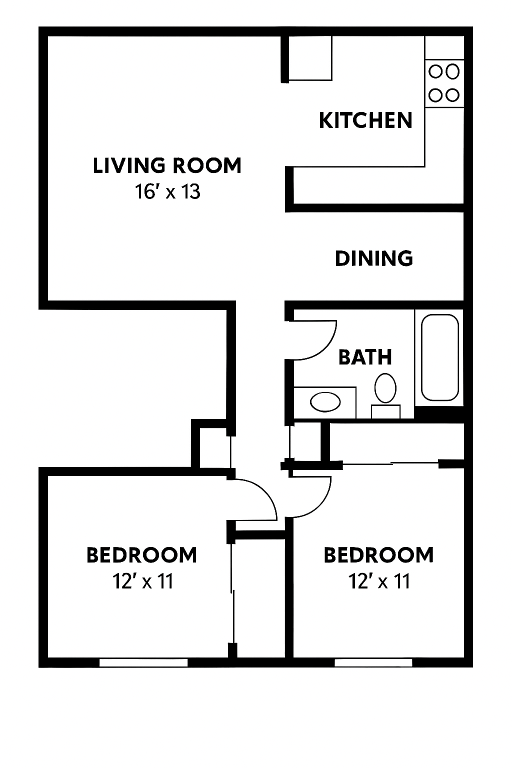 Layout: Two bedrooms, full bathroom, large living room, and efficient kitchen.
